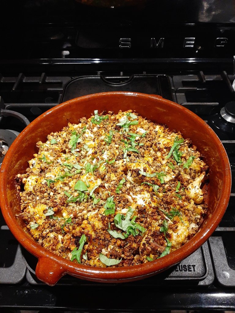 For the crumble, mix 50 grams of old bread in the blender. Mix with 30 grams of grated pecorino, fresh basil, a drizzle of olive oil, 25 grams of pine nuts, pepper and salt. Spread evenly on the cauliflower. Bake in the oven at 180° for 25-30 minutes, until golden brown and hot. Finish with fresh basil. Serve as a side dish for 4, or as a main dish for 2p.