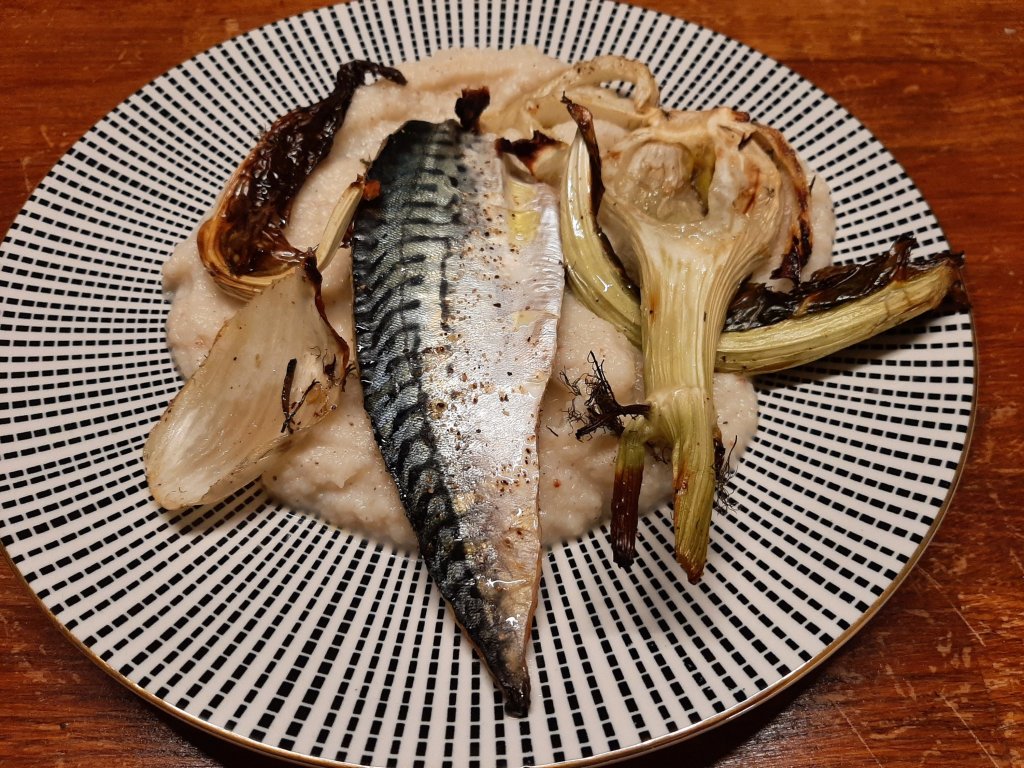 While boiling the cauliflower, slice 1 fennel. Put on baking paper. Spread a drizzle of olive, pepper, salt and 1 table spoon of dried thyme. Roast in the oven at 220° during 20-30 minutes. Turn halfway. Add the mackerel filets on the baking tray during the last 5-10 min.
