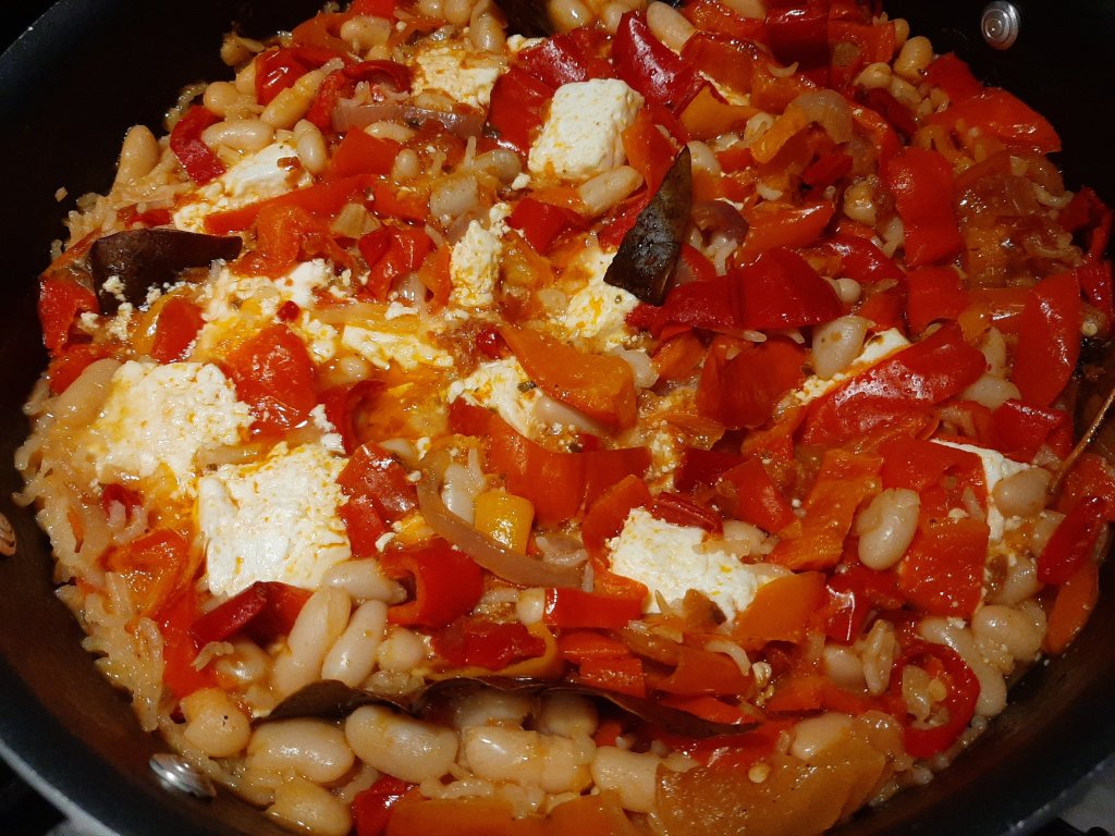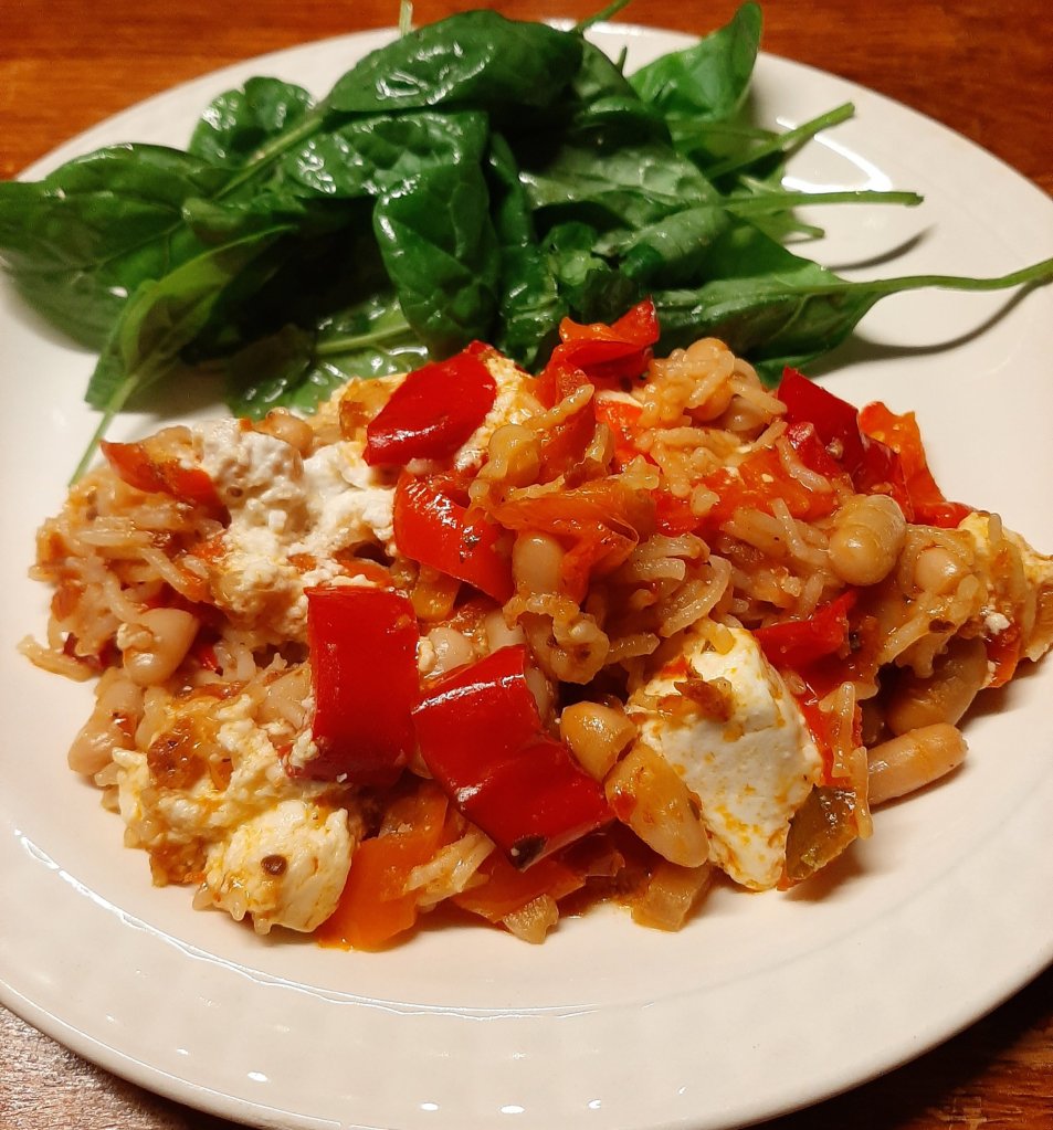 Add 120 grams of basmati rice, 2 table spoons of sun-dried tomato paste, 1 can of cannellini beans with the liquid and 1, 5 cup of water. Cut 200 grams of feta cheese in cubes. Add to the pan. Stir. Put the lid on the pan. Put back in the oven for 30 minutes ( until the rice is al dente). Serve with baby spinach seasoned with olive oil and red wine vinegar. 👍👍