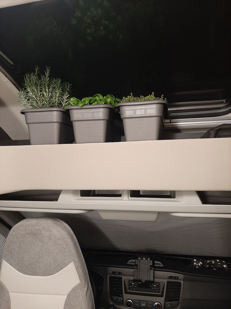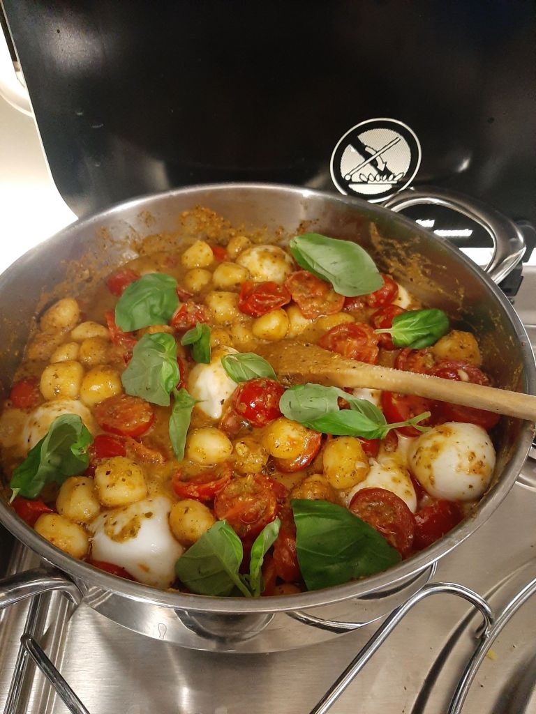 For this easy all in one dish, chop 4 garlic cloves. Fry in a little drizzle of olive oil. Add 500 grams of halved cherry tomatoes, 1 teaspoon of dried basil, salt and lots of pepper. Allow to simmer for approximately 10 minutes. Add 500 grams of ready made gnocchi and 2 table spoons of ready-made good quality classical basil pesto. Stir regularly. Once the gnocchi are ready, spread 200 grams of mozzarella di Buffalo. Allow to simmer a little bit longer. Finish with fresh basil ( I forgot to mention, thanks to the idea of our amazing friend Leen, I decided to install a small garden with fresh herbs  in Gloria).