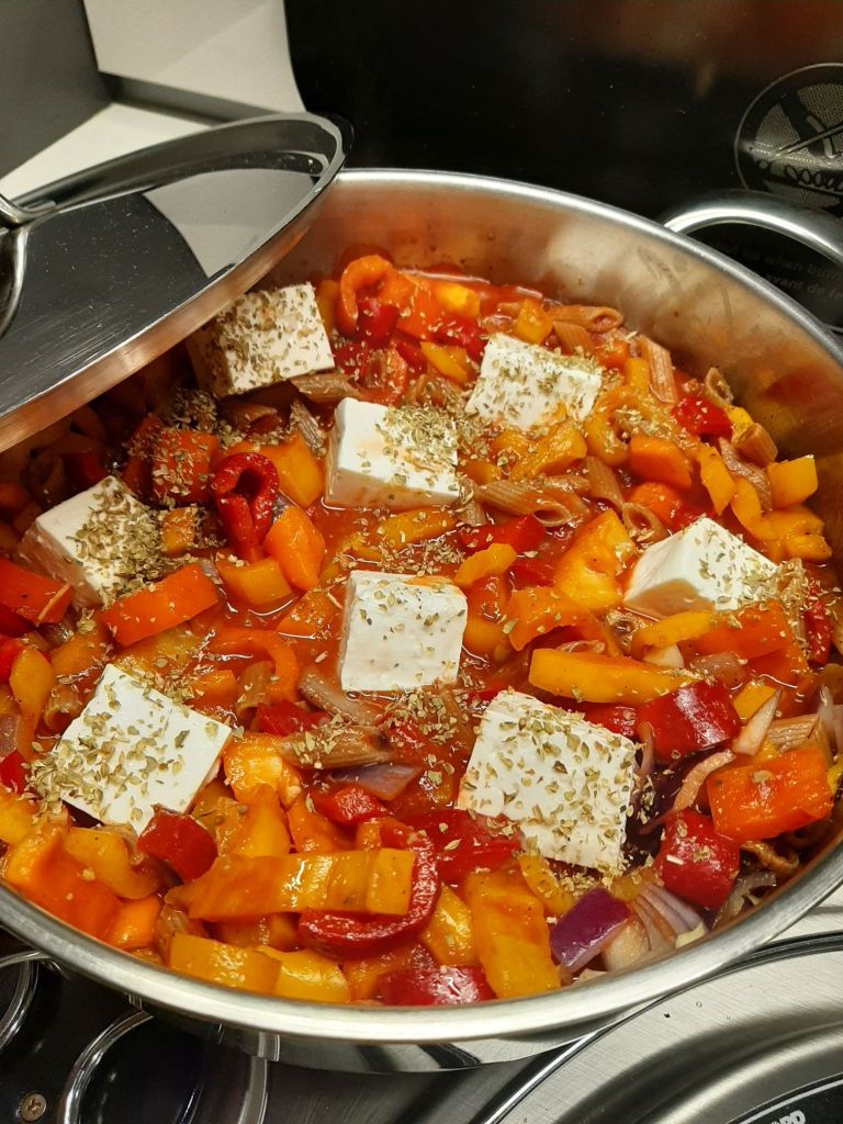 Chop and fry 1 red onion, 4 beautiful sweet bell peppers, 4 garlic cloves in a drizzle of olive oil for a few minutes. Add 150 grams of whole wheat pasta. Stir. Add 2 teaspoons of dried oregano, 1/2 cube of good quality vegetal stock, black pepper and 500 ml of tomato passata. Stir and allow to simmer. After 5 minutes, spread 200 grams of feta cubes. Close the pan and continue to simmer. Stir now and again. Cook until the pasta is al dente. The feta cheese has completely dissolved and creates a creamy effect.