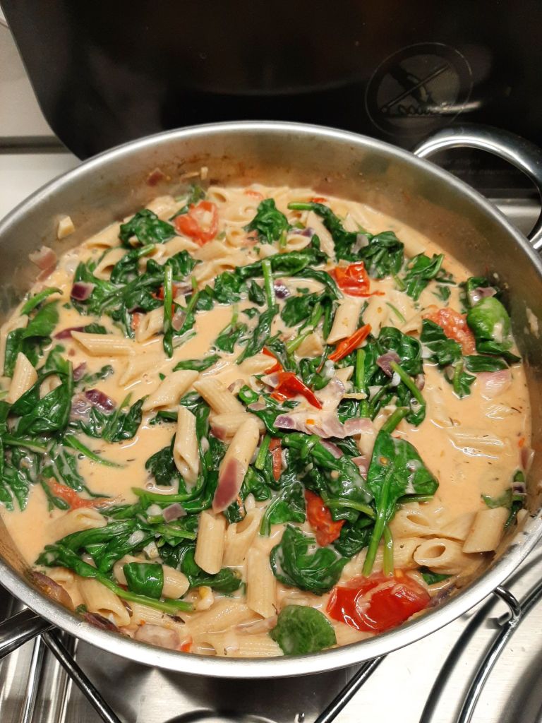 Boil 140 grams of whole wheat pasta in boiling salted water for 5-7 minutes in the favorite simmer pan. Even if not yet al dente, pour the whole lot ( water and pasta) in another recipient to continue the cooking process ( and save the gas). Continue to use the same pan. Reheat. Add a drizzle of olive oil. Chop and fry 4 garlic cloves, 1 red onion, 2 chilies for a few minutes with the content of 1 little can of anchovies on oil. Add 2 teaspoons of dried oregano and 1 teaspoon of dried thyme. Stir and continue to bake. Add the halved cherry tomatoes. Bake and stir. After 5 minutes, add the baby spinach in portions. Stir and continue to bake. Add the light cream. Taste, add pepper and salt if needed. Stir regularly. Once ready, add the drained, al dente pasta. Finish with grated parmesan. Enjoy an easy, tasty campervan recipe.