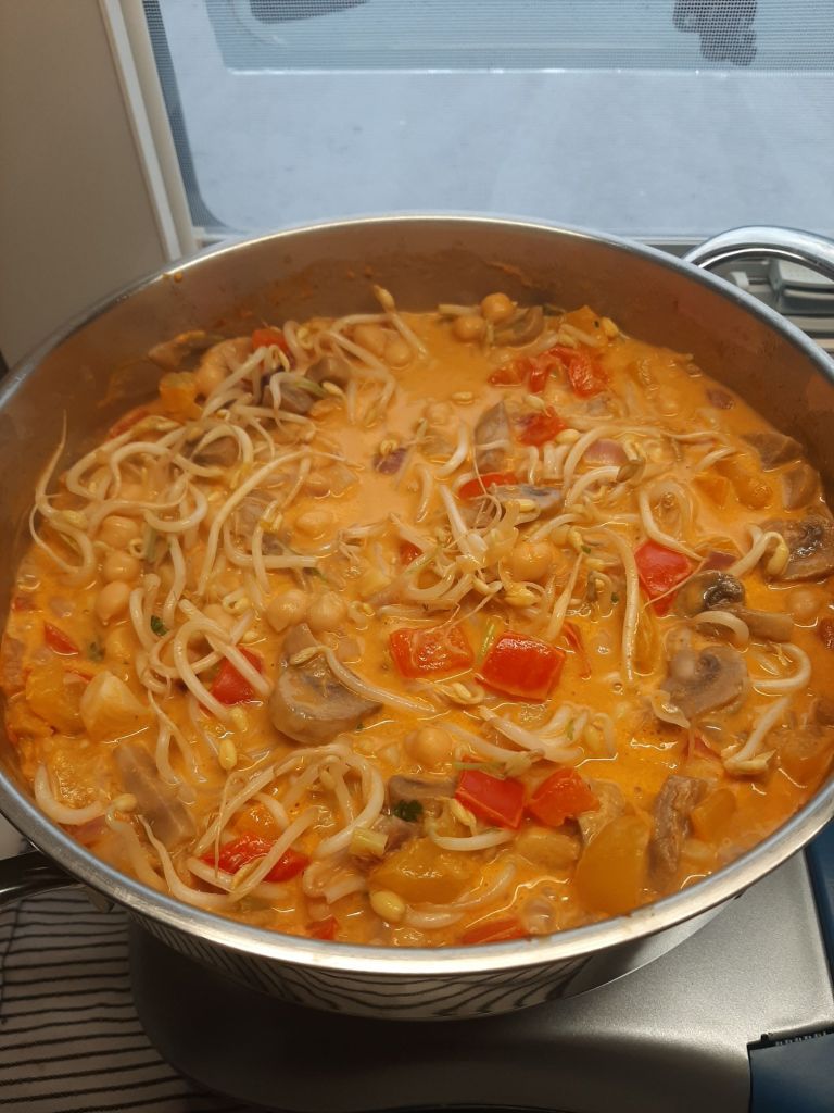 Chop the onion, 4 garlic cloves, 4cm of fresh ginger, the bell pepper. Put in the simmer pan. Add 1 large table spoon of curry paste and 1 large table spoon of olive oil. Heat the pan. Stir regularly. After 5-10 minutes, add the chopped mushrooms and the chopped white parts of the spring onions. Stir and bake. Add the can of chickpeas with the aquafaba and the 200 ml of coconut milk. Stir and allow to simmer and to evaporate. After 10-15 minutes, add the soy sprouts. Stir and continue to simmer. After a few minutes, stop the fire, spread the chopped green of the spring onions and some fresh coriander ( the last part of my harvest😥).