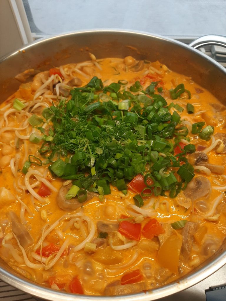 My ingredients for today’s dinner: red onion, garlic, spring onions, ginger, thai red curry paste ( remember my storage 😋), 1 red bell pepper, 1 orange bell pepper, 250 grams of mushrooms, 200 grams of soy sprouts, 200 ml coconut milk, 1 can of chickpeas and 120 grams of basmati rice.