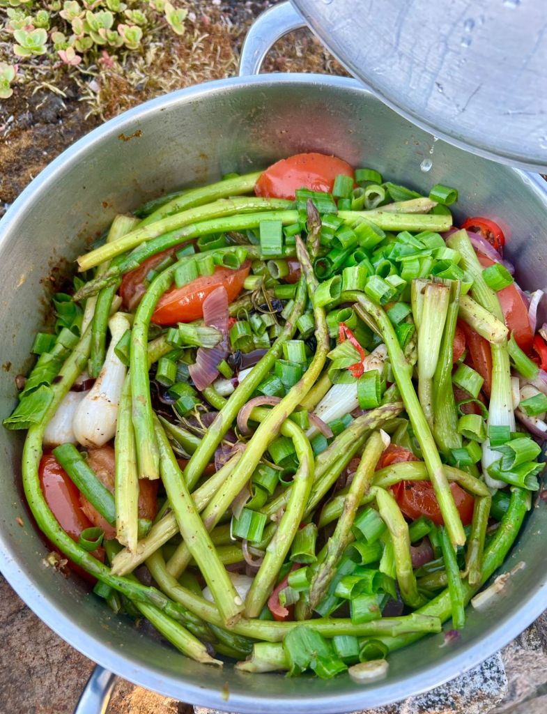 Nothing better than a side dish with green asparagus, tomatoes and spring onions.