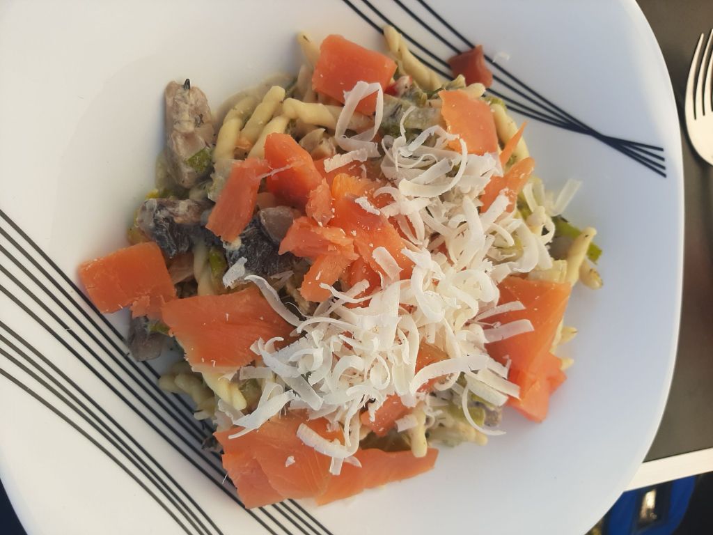 I have some leek and mushrooms as vegetables. I thought to serve them with a creamy pasta, combined with crispy bacon for me and smoked salmon for Iris.