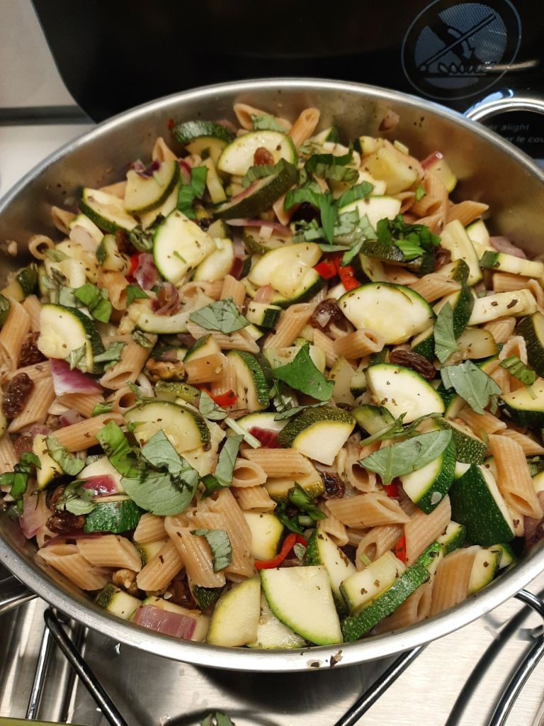 Chop and fry 4 garlic cloves, 1 red chili and 1 red onion in a drizzle of olive oil. Add 3 chopped larger medium sized courgettes ( approximately 750-800 grams for 2 is our portion), 1 table spoon of dried basil and salt. Continue to bake. Add the pistachio and the raisins with the marinade. Continue to bake.
