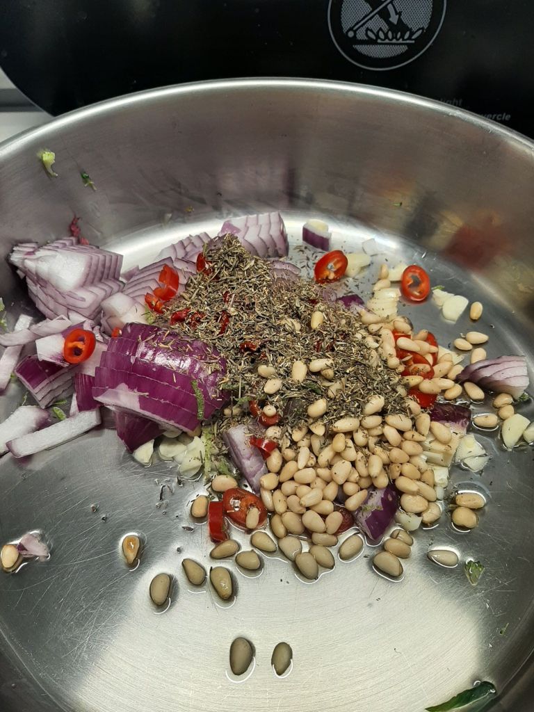 Chop 1 red onion, 4 garlic cloves and 1 chili. Put them in a simmer pan. Add the olive oil of 1 small can of anchovies. 1 table spoon of dried thyme and 40 grams of pine nuts. Heat the pan. Start frying. Stir and bake.
