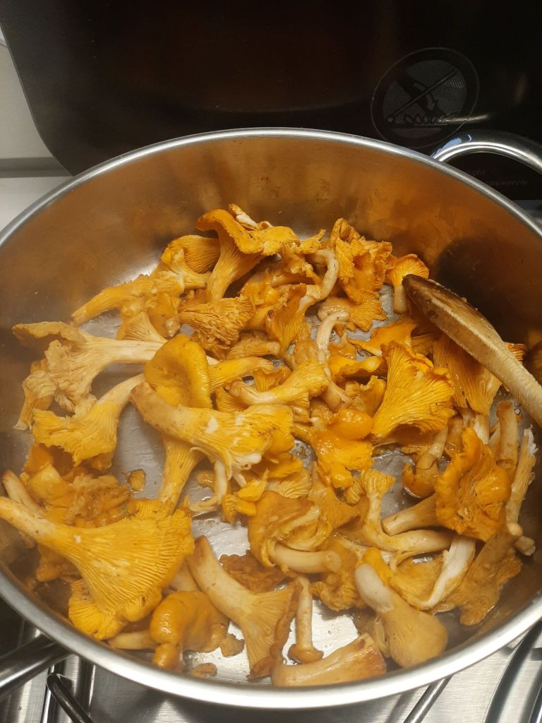 Bake 300 grams of fresh chanterelles in a mixture with butter and olive oil for approximately 5-7 minutes. Season with pepper and salt. Set aside