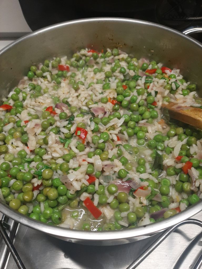Chop and fry 1 red onion, 1 chili and 4 garlic cloves in a drizzle of olive oil. Stir. Add 120 grams of good quality risotto rice. Bake and stir. Add 1 table spoon of dried basil and 150 ml of white wine. Allow to evaporate. Add the zeste of 1 untreated lemon and vegetable stock( made with 1 cube and 350 ml of water) bit by bit while stirring regularly. Continue until the rice is almost al dente. Add 400 grams of frozen peas. Allow to simmer until everything is al dente.