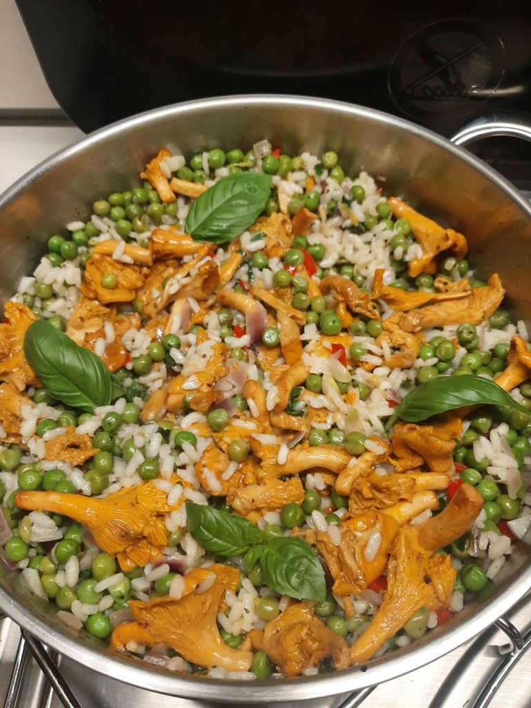 We are in Estonia since a few days. My visit to the grocery stores is even more adventurous, but there are beautiful chanterelles for a reasonable price. Iris asked me if we could have risotto for dinner. After seeing those amazing mushrooms I decide to prepare a risotto with green peas ( from the freezer department) and fresh chanterelles.