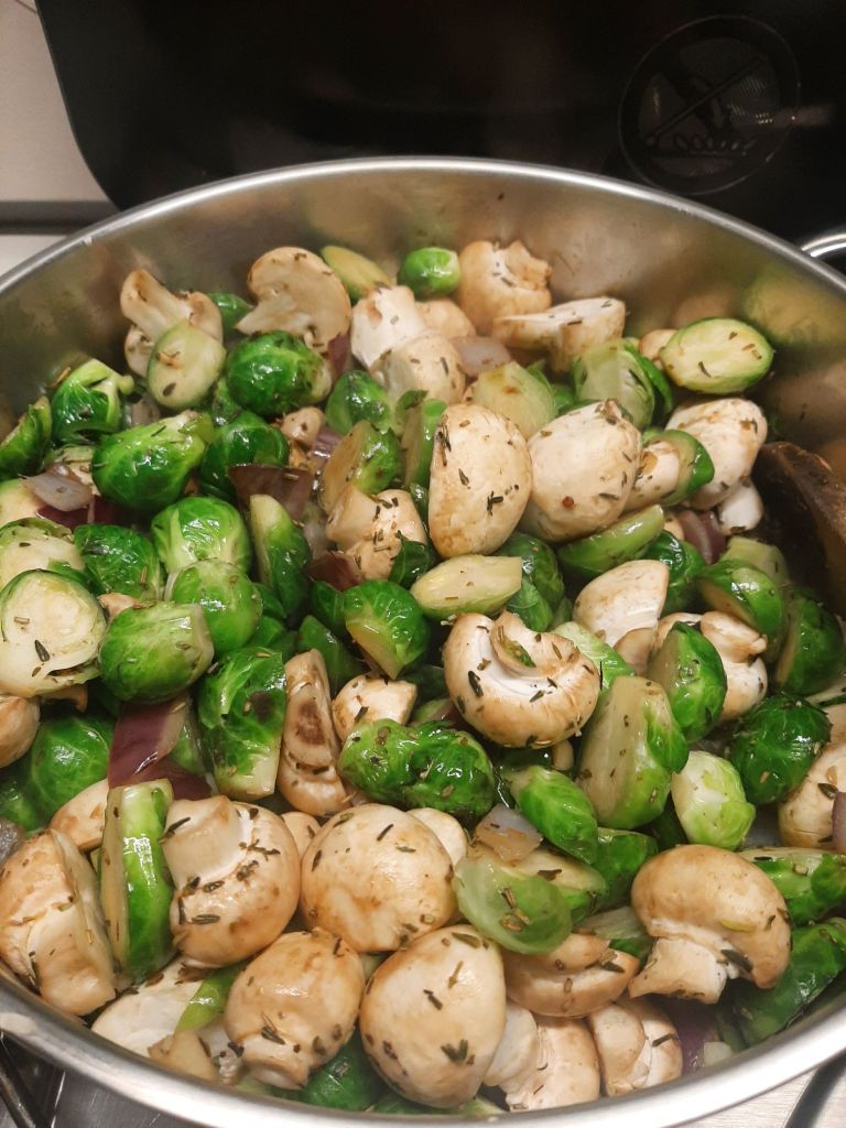 Wash, clean and halve 500 grams of brussel’s sprouts. Put in the simmer pan. Add 1 chopped red onion, 4 chopped garlic cloves, 2 sliced green chili peppers. Add 2 teaspoons of dried rosemary and 1 teaspoon of dried thyme. Add 2 table spoons of olive oil. Mix and start to bake. Stir regularly while baking.