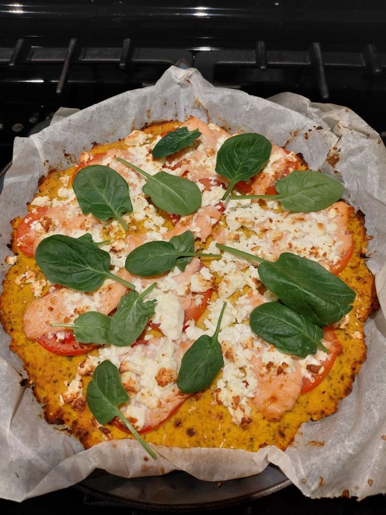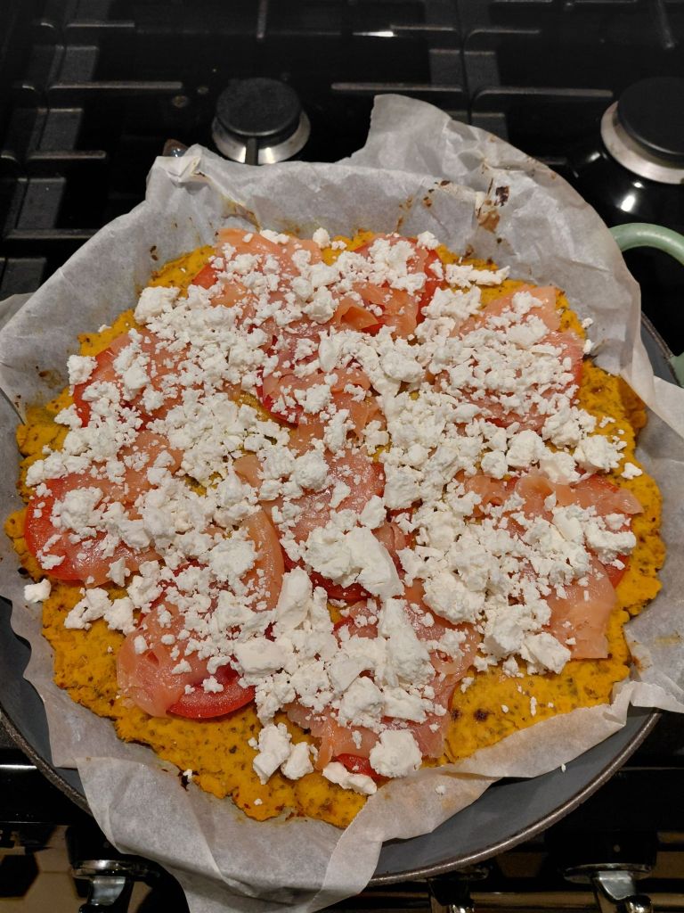 Brush some olive oil on the pumkin. Preheat the oven at 200 °. Bake for 15 minutes. Spread thin slices of a tomato on the ‘pizza’. Spread 100 grams of smoked salmon. Finish with 100 grams of crumbled feta.