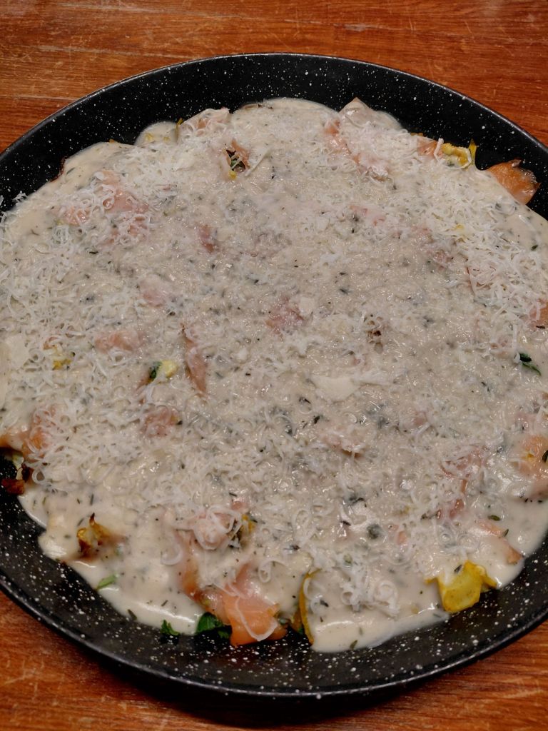 Finish with the bechamel sauce and 30 grams of grated pecorino.  Cover the dish and store cool.