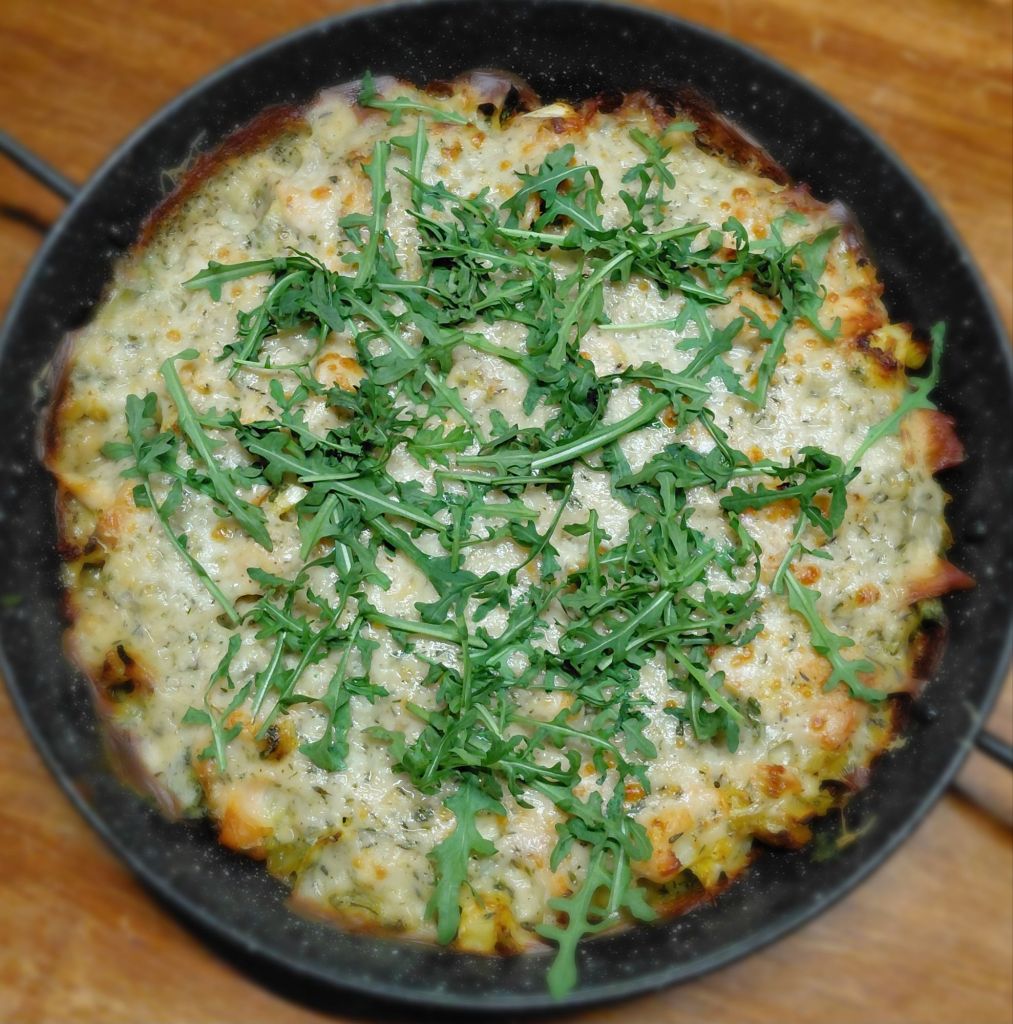 Preheat the oven at 200°. Bake the dish for 20-25minutes. Serve with arugula.