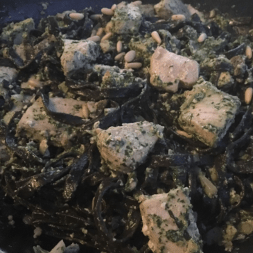 Blend 100 grams of arugula (rocket salad ), 1 garlic clove, 25 grams of parmigiano, a pinch of sugar (or stevia), 40 grams of roasted pine nuts. Add olive oil to obtain a proper pesto, add pepper and salt. Marinate 400 grams of swordfish cubes in 2 table spoons of chopped fresh basil, the zeste … More Black, green and white, less common on our plate